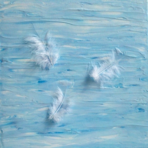 30 X 30 cm. Leinwand auf Rahmen gespannt. Collage mit Federn. Acrylfarbe.