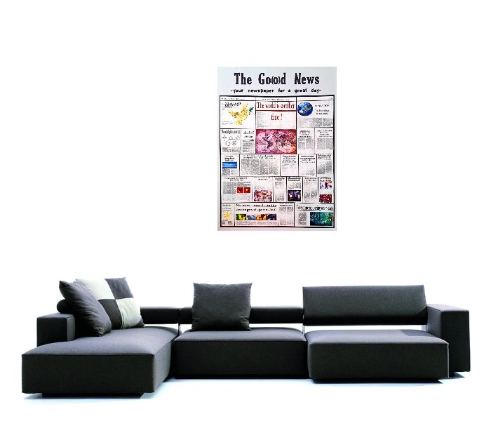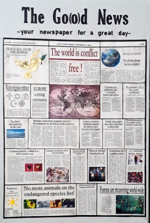 The Good / Go(o)d News war eine sehr aufwendige Collage und eine Herzensangelegenheit von mir. Der Titel steht für gute Nachrichten, die ich mir persönlich wünsche. Denn egal, welche Art von Medien man nutzt, größtenteils beherrschen Negativnachrichten den Tag. Die Collage in Form einer Zeitungs-Titelseite zu erarbeiten war für mich naheliegend. Ich bin und war die negativen täglichen Nachrichten leid und habe somit meine eigene Zeitung, zumindest die Titelseite, mit Schlagzeilen zusammengestellt, die ich gerne lesen würde. Sicher sind nicht alle Nachrichten, die für mich gut sind, für andere auch gut.