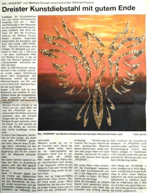 | Unglaublich, aber wahr. Am 1. Weihnachtsfeiertag, während der traditionellen Weihnachtsparty in der Wegwarte, hat ein dreister Kunstdieb den PHOENIX einfach von der Wand abgehängt und ist damit rausmarschiert. Wäre ich nicht da gewesen, hätte der Kunstraub klappen können, da ja keiner vermutete, dass jemand so skrupellos sein kann und das Bild unter Hunderten von Menschen einfach stiehlt. Ich wurde daraufaufmerksamt gemacht, indem eine Bekannte mir gratulierte, dass ich den PHOENIX verkauft hätte. Ich verneinte und sah dann die leere Wand. Ich rief sofort die Polizei. Dank aufmerksamer Zeugen und Hinweise konnte der Dieb jedoch gefasst und der PHOENIX aus dem Kofferraum des Diebes sichergestellt werden. Jetzt hängt er wieder und ist durch seine aufregende Geschichte am Weihnachtstag im Wert gestiegen. Eure Barbara