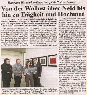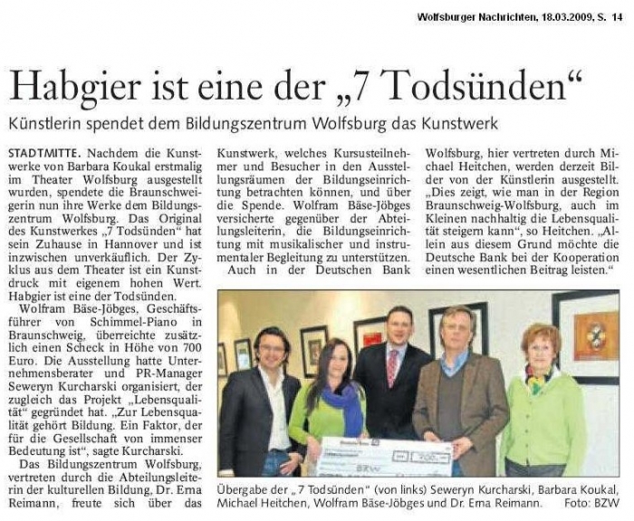 ich freue mich mittelien zu können, dass die Spendenaktion in Wolfsburg erfolgreich abgeschlossen werden konnte. Auf diesem Wege möchte ich mich ganz herzlich bei folgenden Personen für Ihre freundliche Unterstützung bedanken: Herrn Seweryn Kucharski (Initiator), Frau Stolz und Herrn Reiner Steinkamp (Theater Wolfsburg), Herrn Carsten Blasche und Herrn Michael Heitchen (Deutsche Bank Wolfsburg), Herrn Wolfram Bäse-Jöbges (Schimmel Auswahlcentrum Braunschweig), sowie Frau Dr. Erna Reimann und Frau Susann Köhler (BZW Wolfsburg). Die Ausstellung in der Deutschen Bank in Wolfsburg wurde auf Wunsch bis zum 30. April verlängert. Die "7 TODSÜNDEN" können Sie sich im BZW in Wolfsburg ansehen. Nachdem die Presse darüber berichtet hat, werde ich es hier veröffentlichen. Eure Barbara Koukal |