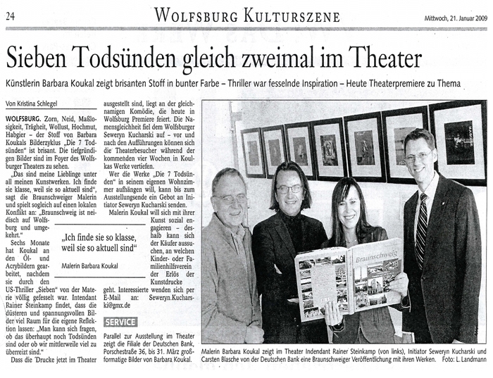 Das Theater Wolfsburg wird also rechtzeitig zur Premiere der Komödie „Die 7 Todsünden" aus Berlin, am 21. Januar 2009, die Kunstdrucke der sieben Todsünden aus Braunschweig im eigenen Foyer ausstellen. Dieser Zyklus wird vier Wochen lang den Besuchern des Theaters präsentiert . Die Deutsche Bank Wolfsburg bietet regelmäßig Künstlern die Möglichkeit, innerhalb der eigenen Geschäftsräume, deren Werke auszustellen. Für die nächsten zwei Monate sind im Geschäftskundenbereich bei der Deutschen Bank in der Porschestraße einige meiner Kunstwerke zu sehen. Ebenso in VIP-Lounge der Deutschen Bank in der Volkswagen-Arena Wolfsburg. Der Initiator, Herr Seweryn Kucharski, fand diese Gemeinsamkeiten und konnte alle Beteiligten vom Potential eines gemeinsamen Engagements bei diesem Projekt zum Thema Kultur überzeugen. Wobei er damit seine Heimatstadt Wolfsburg und die Region unterstützt. Auch in Wolfsburg möchte ich mich sozial engagieren! Im Gegenzug für eine Spende an einen Kinder-/Familienhilfsverein Ihrer Wahl -aus unserer Region- werde ich Ihnen sehr gern den im Theater Wolfsburg ausgestellten Kunstruck-Zyklus "DIE 7 TODSÜNDEN" im Anschluss überlassen. Möchten Sie helfen, dann teilen Sie bitte Ihr Interesse bzw. Ihr Gebot dem Initiator dieses Projektes, das unsere Region unterstützt, umgehend mit.