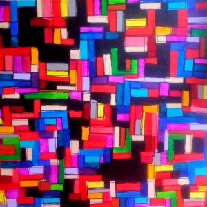 Einige Werke der Malerin sind nun in den Kultfenstern in der Friedrich-Wilhelm-Straße - zwischen Hauptpost und Döner-Dreieck - zu sehen. Darunter etwa der „Zauberwürfel" (Leinwand, auf Rahmen gespannt).