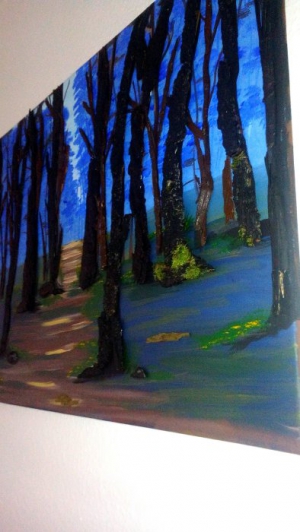 Das ist das bisher aufwendigste Bild, was ich je erarbeitet habe :-) Die Schwierigkeit bestand darin, dass das Bild für Sehendne angenehm zu betrachten ist und für sie als Blinde zu ertasten. VIEL ARBEIT! Erst das Bild malen, dann bin ich stundenlang durch den Elm gegangen und habe Rinde und Ästchen gesammtel, dann alles zurechtgeprummelt und dann angemalt und so aufgeklebt, dass es den Berührungen standhält. Jetzt kommt noch der Waldboden und dann bin ich nach 3 Monaten fertig :-) Das Unikat ist sehr gut geworden. Die Kundin war begeister und ich bin glücklich darüber. |